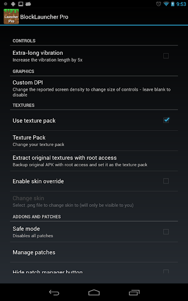 BlockLauncher Pro is a custom Minecraft Pocket Edition launcher that wraps around Minecraft PE and provides loading of patches, texture packs, and server IPs.